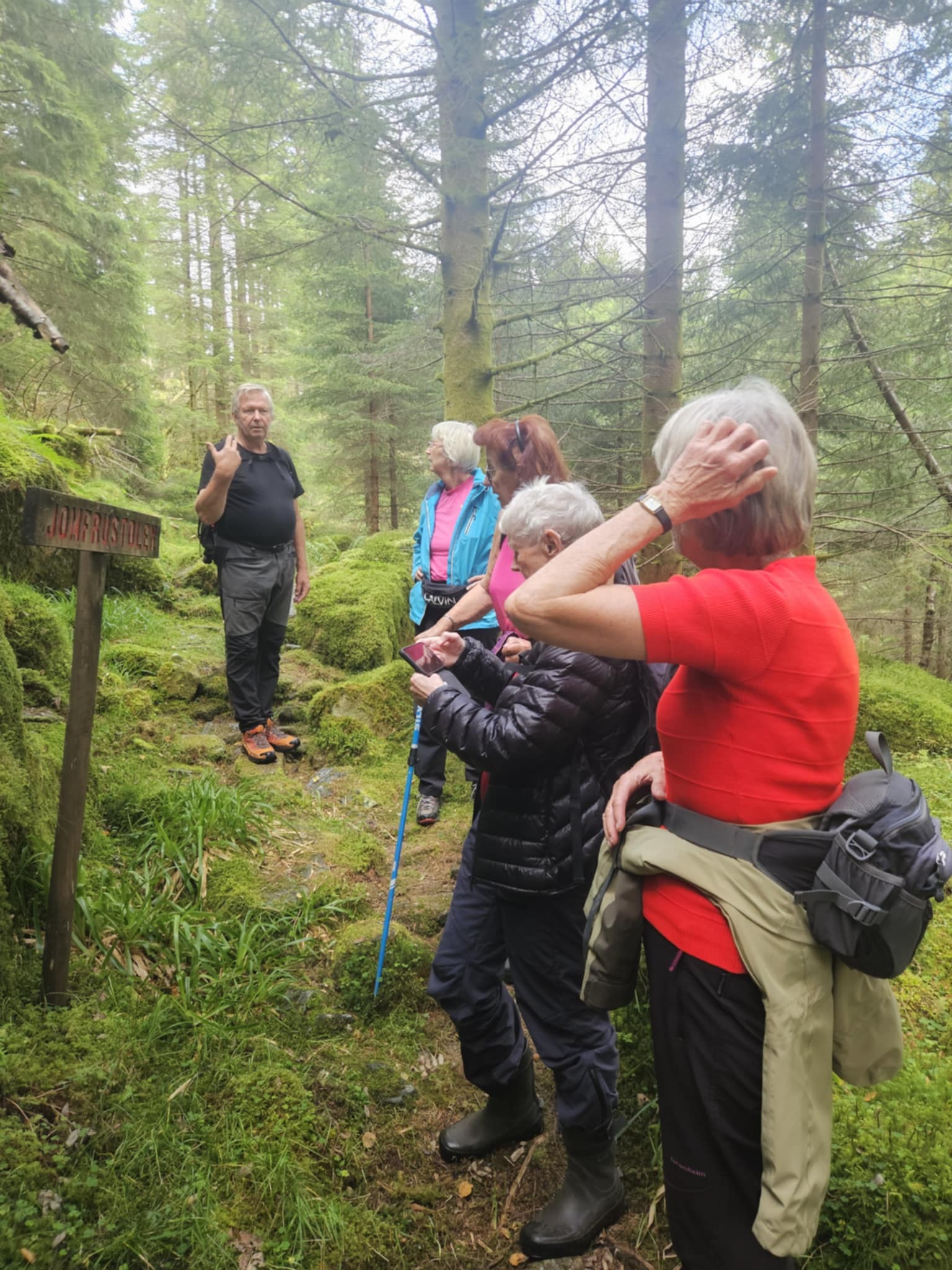På vegen passerte me Hestasteinen, Jomfrustolen og Selabotskjelda. Då var det veldig kjekt å ha med kjentmann Leif Magne Hovland som kunne fortelja historia bak desse finurlege stadane og skilta langs stien.