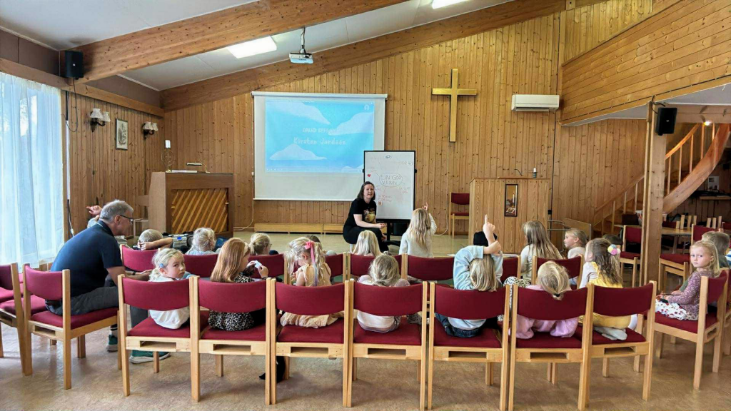 Etter me hadde samla oss i storsalen og alle hadde fått namnelapp på brystet, var det tid for ei vennskapsøkt. Me lærte den gylne regelen, fekk høyra forteljinga om den barmhjertige samaritanen og og snakka om kva ein god venn gjer. Borna hadde mange gode innspel og tankar om det å vera ein god venn.