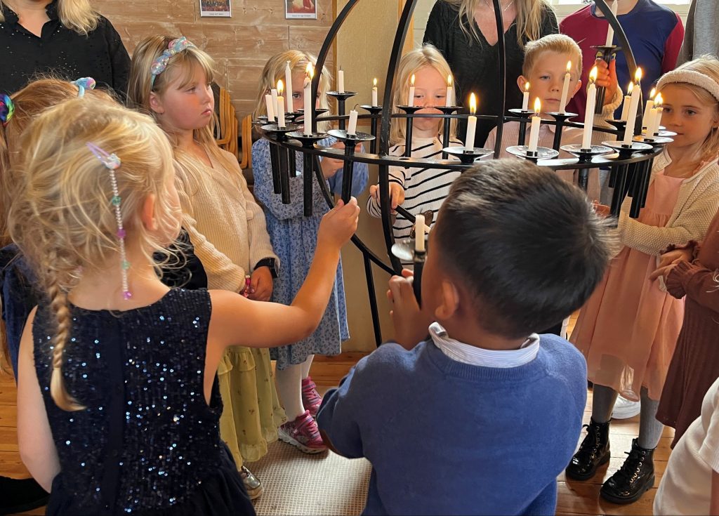 Søndag var det klart for “skulesekkgudsteneste” i Tysnes kyrkje. Flotte fysteklassingar gjekk i prosesjon inn i kyrkja, med skulesekkar på ryggen og blomar i hendene. Det vart ei flott gudsteneste med mykje song, litt gym, ei preike som inneheldt doven cola, stemningsfull lystenning og velsigning med teikn. Og ikkje minst – alle fyrsteklassingane fekk si heilt eiga “Tre i eit tre”-bok.