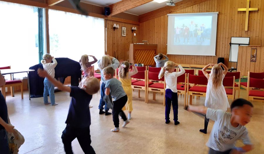 Vidare gjekk det slag i slag – me øvde på songen “Jesus er vår venn”, me fargela fine bokmerke med bibelvers på, me var ein tur borte i kyrkja og førebudde oss på søndagens gudsteneste, me åt frukt og hadde vennskapsbingo. Dagen avslutta me på topp med BlimE!-dansen, før slite, men glade born vart henta av foreldra.