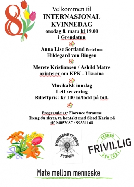 Onsdag 8. mars vil Tysnes Kvinnenettverk og Tysnes Frivilligsentral markera Den internasjonale kvinnedagen.