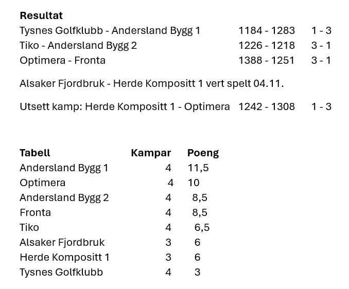 Etter 4 serierundar har ingen av laga skapt stor avstand til dei andre. Resultata i denne serierunden var på det jamne, og ingen spelarar kom over 500 pinnefall.