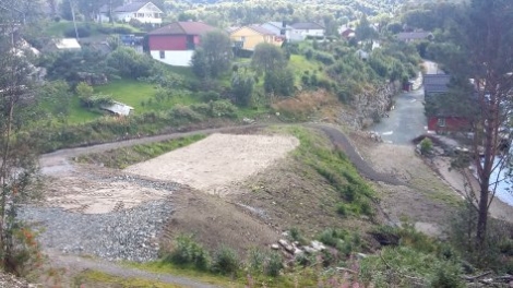 Vegen ned til stranda, og den framtidige beachvolleyballbanen byrjar å ta form.