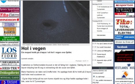 I juli var det ei sak om hol i asfalten ved krysset til Solheimsdalen. Måten dette vart skreve på, ganske så rett fram, såg dei komikken i og gjengav det på radioen i dag. Det er klart når Oslo-folk skal lesa nynorsk, gjer det jo enno meir komisk.