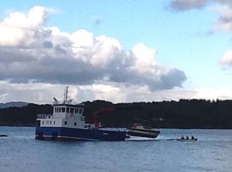 Båten som stod på grunn ved Gjeslingane vart berga av trimaranen Tørris laurdag kveld. Den lange 80 tonnmeter kranen løfta båten rett opp av skjeret.