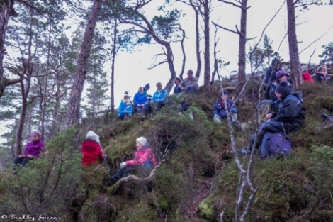 Vinden var kald på toppen, så vi søkte ly litt ned i skogen. Det gikk bra, og da det ble litt politisk diskusjon, så steg temperaturen raskt. Men slikt går snart over, så vi kjølnet raskt av igjen når vi beveget oss ut av skogen. Gjesteboka på toppen ble det naturligvis skrevet i. Onarheim I.L. fikk dermed noen ekstra tiere som sikkert kommer godt med. Alsaker gir nemlig 10 kr. for hver underskrift og de har det blitt mange av etter hvert. Så bar det ned igjen og turen neste torsdag ble det bestemt skulle gå til Barmen Hovda. Takk for en fin tur.