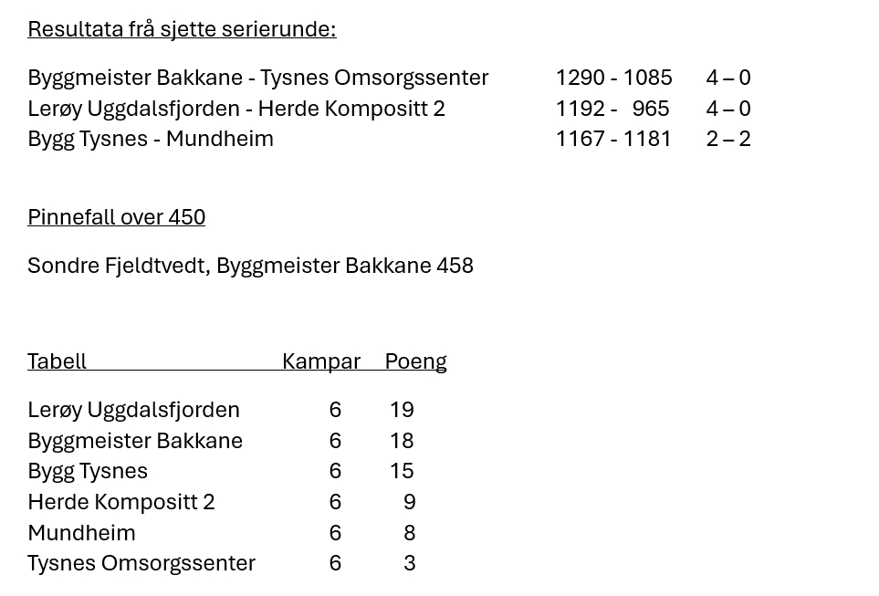 Etter seks serierundar i 2. divisjon er det Lerøy Uggdalsfjorden som har teke leiinga med 19 poeng. Like bak følgjer Byggmeister Bakkane med 18. Sistnemnde lag fekk klart høgast pinnefall i denne runden med1290.