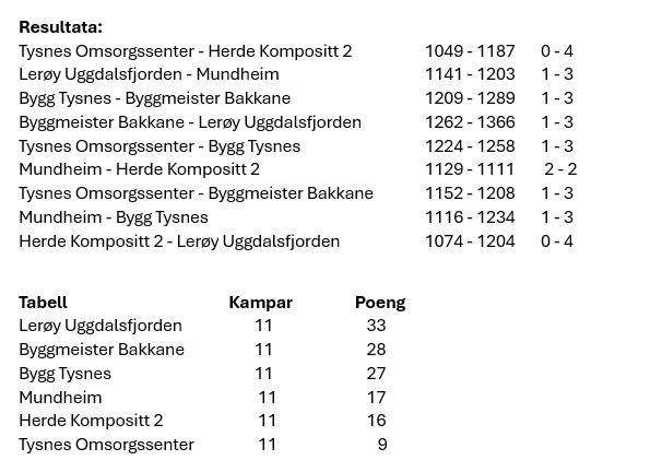 Resultata viser at Lerøy Uggdalsfjorden no har eit forsprang på fem pong ned til Byggmeister Bakkane.