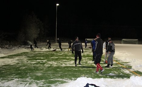 Men Njardar har kjøpt inn snømåker, og både i går og i dag har fotballspelarane hatt som oppvarming å måka eit lite treningsfelt.