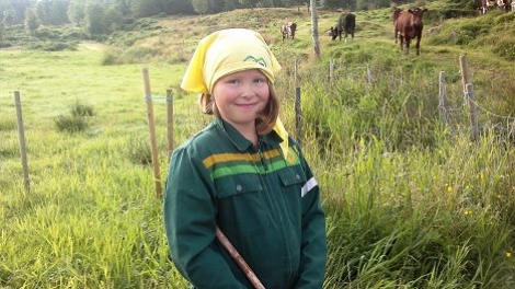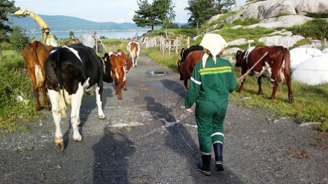 Bilete 3 og 4: Sofie jagar kyrne ut på beite. Det ligg mykje arbeid bak for å skaffa mjølk i butikkane før andre kan få til frukost.