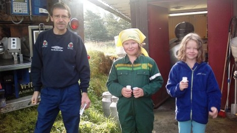 Bilete 1 og 2: Nokre av dei som var tidleg oppe søndagmorgon for å mjølka kyrne på Gjøvåg var Harald, Sofie og Marthe. Dei måtte vera ferdig før klokka 8, for då kjem Lars Torbjørn Bondhus med mjølkebilen for å henta mjølka, for så å køyra den inn til meieriet.