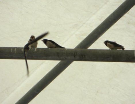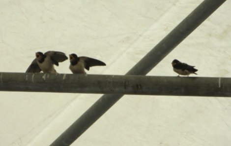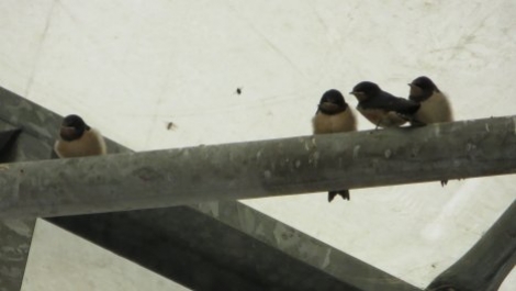 Innsendaren av bileta fortel til Tysnesngen.no at det var ein fæla sjau i rubbhallen, heilt til han gjekk inn. Då var det heilt stille! Når han såg seg rundt, såg han fire svaleungar som perler på ei snor som sat og kikka ned på han.