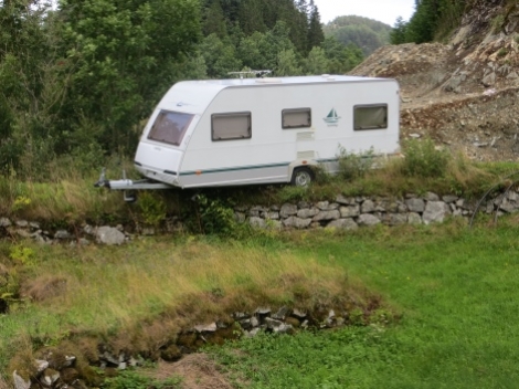 Ein liten dump i bakken, ei tue og ein god porsjon flaks gjorde at denne campingvogna ikkje vart blesen utfor kanten.