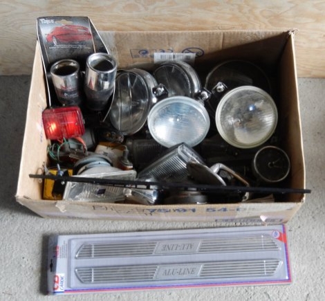 Hjelm, L 60 og ein kasse med diverse bildeler til salgs.