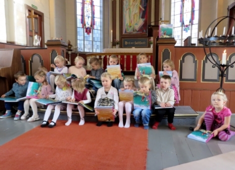 4 åringane var i dag spesielt inviterte på familiegudstenesta der dei fekk utdelt kvar sin biletbibel, gjekk i prosesjon og var med og sang.