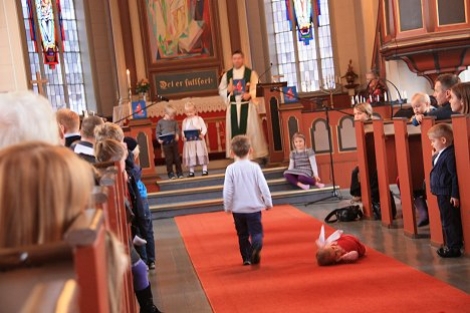 Det var mellom anna utdeling av “Mi kyrkjebok” til 4-åringane i kommunen. Prest Jørgen Knudsen hadde gudstenesta og hadde ein lett og morosam tone med ungane. Han tok dei med på ei lita skattejakt rundtom i kyrkja, noko som fenga godt. Innimellom var det songar som ungane var med på.