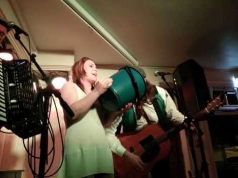 Ei “frivillig” frå publikum måtte opp og halde ei bøtte som Bjørn Jensen kunne skrika i, dette for å få den rette lydeffekten.