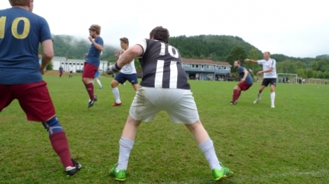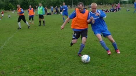 Veteranar: Tidlegare spiss på Florvåg og Askøy i 3. divisjon, Stian Nesse (i blått), har vore med å prega Tysnescup saman med laget sitt Kristoffer United sidan oppstarten av cupen i 1997. I fjor vann Kristoffer United klassen for sårbeinte menn, i år måtte dei sjå seg slått av fitjarlaget Blue Oyster Boys i semifinalen.