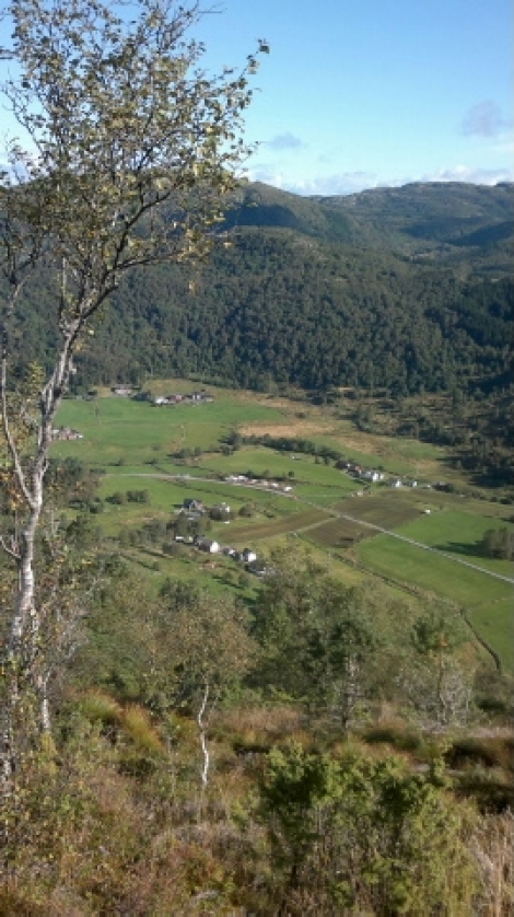 Bileta viser Uggdalsdalen og utsyn vestover mot Bårdsund – Reksteren og Austevoll.