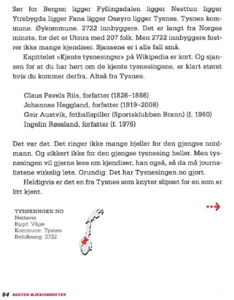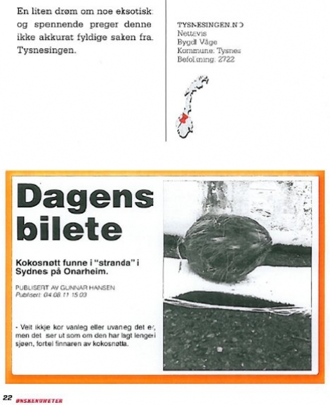Atle Antonsen og Johan Golden har samla hardtslåande nyheiter gjennom fleire år i sitt radioprogram Misjonen. I oktober gav dei ut boka kor topp 100 av desse nyheitene frå distriktsnorge var samla. Tysnesingen.no har den litt tvilsame æra av å ha fått med to saker i boka, under kategorien ønskenyheiter og nesten kjendis nyheiter.