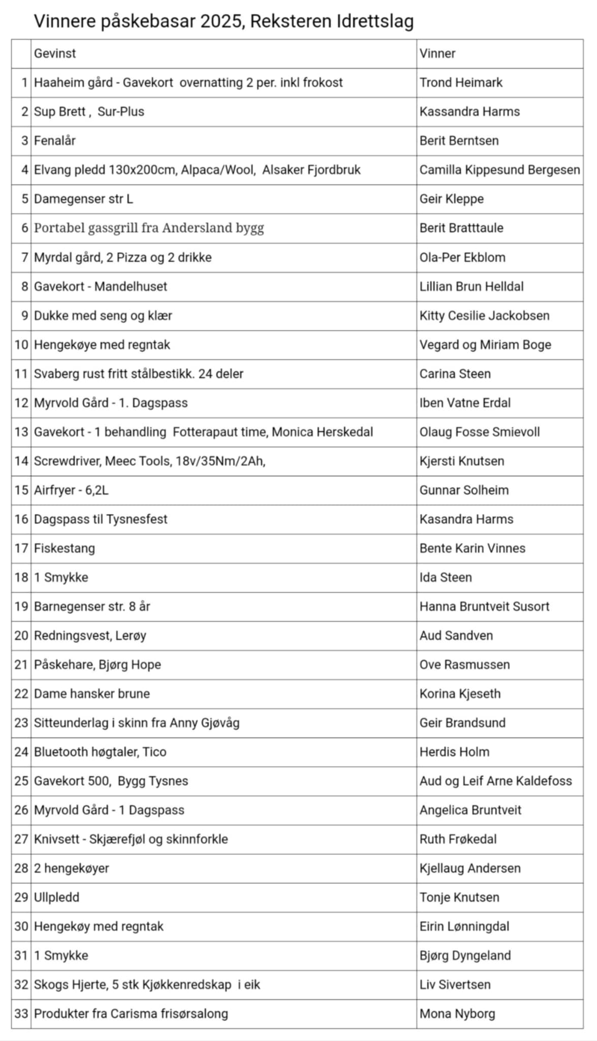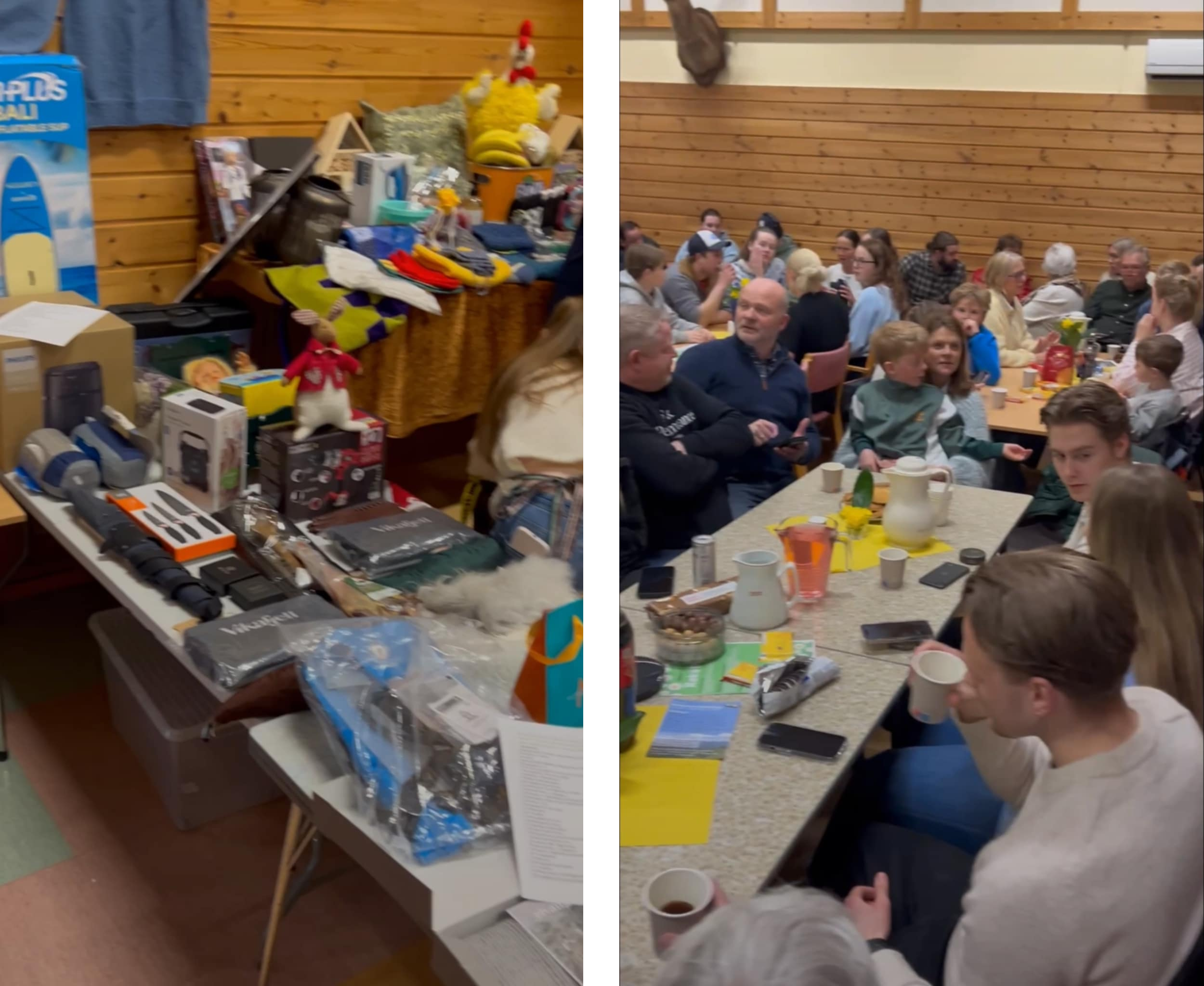 Det stod kø utanfor kulturhuset på Reksteren då dørane åpna kl 16.30 for påskabasar på Skjærtorsdag. Gevinstbordet bugna av flotte gevinstar, og på bøkene var det fleire gobitar. Det var vel rundt 200 både fastbuande og tilreisande som fekk seg ei kjekk oppleving. Åresalg, trekking av bøker og ikkje minst ein koselig drøs rundt bordene.