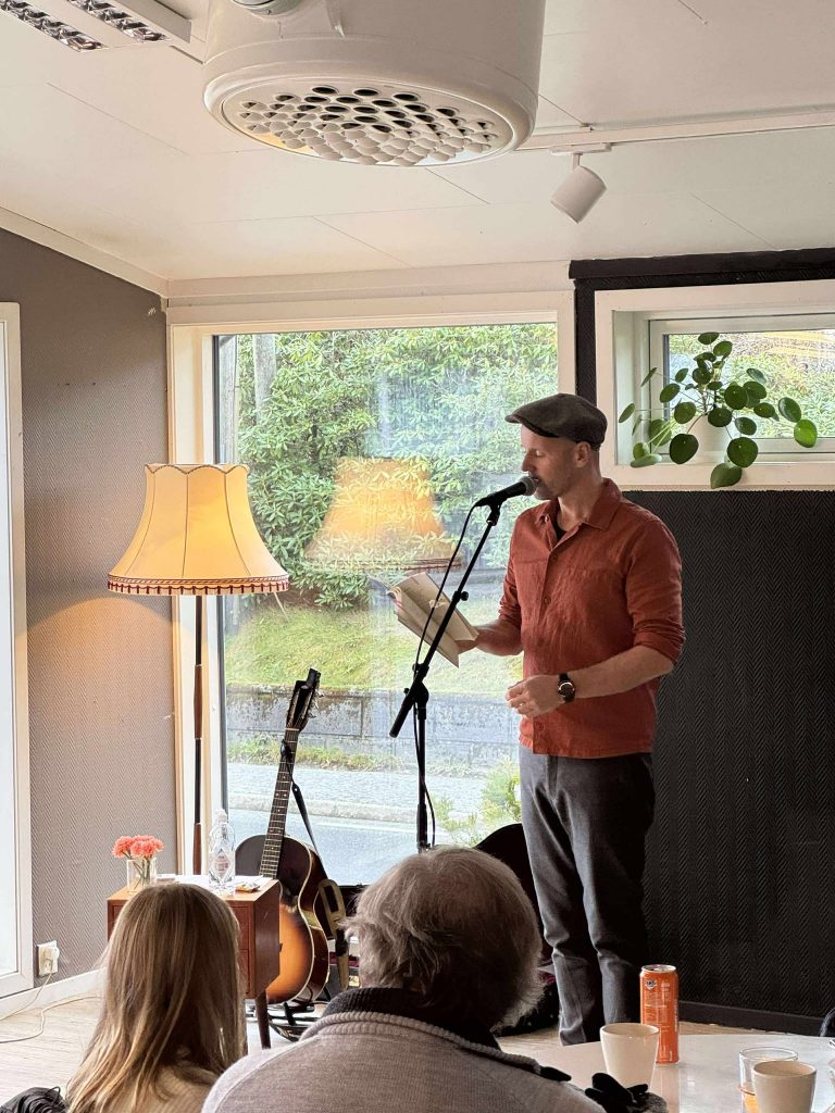 I tillegg til at han leste frå boka, fortalte han og spelte gitar, og sang.