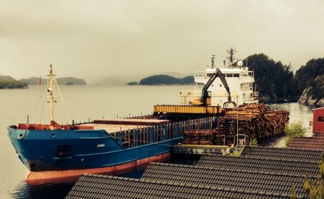 I dag tidleg kom det lastebåt til Heningen for å lasta tømmer. Dette var fyrste leveransen av tømmer frå kaien.