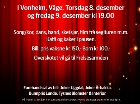 10. klasse ved Tysnes skule inviterer til Juleshow fyrstkomande torsdag 8./12. og fredag 9./12. kl 19:00 i Vonheim Våge.