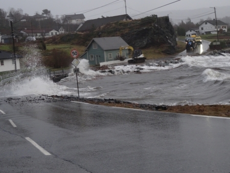 Kraftig sjø på Husabruo ved Dalsjøen i Ølve, 10/1