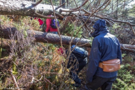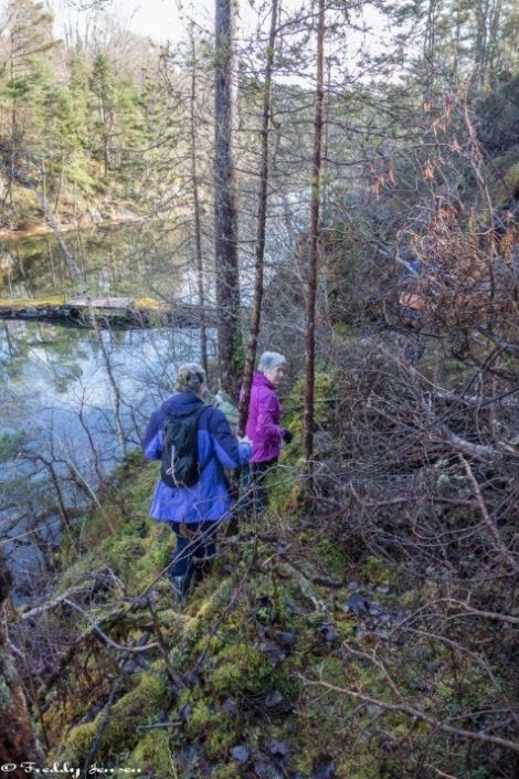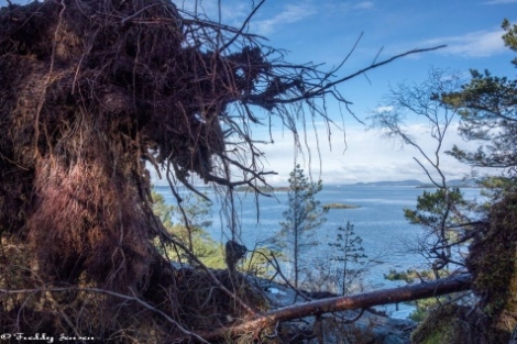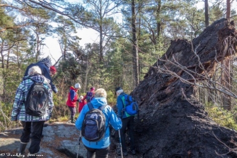 Men det var slett ikke enkelt lenger. “Nina” hadde lagt ned en rekke hindre på veien i form av store furutrær + at vi støtte på høy flo som gjorde den vanlige stien ufremkommelig uten gummistøvler. Likevel, denne gjengen lar seg ikke stoppe så lett. Vi kom oss fremover langs den gamle stien, men akk, brua over til Maurholmen var vekke så “Verdens ende” var ikke mulig å nå denne veien. Dermed gikk vi mot “Middelhavet” og Godøysund. Veien var kronglete, gjengrodd og bratt, og dermed ble vi delt i 2 grupper på veien siden noen var litt dristigere, men vi møttes igjen ved Godøysund og fikk nyte mat og drikke i deilig vårsol.