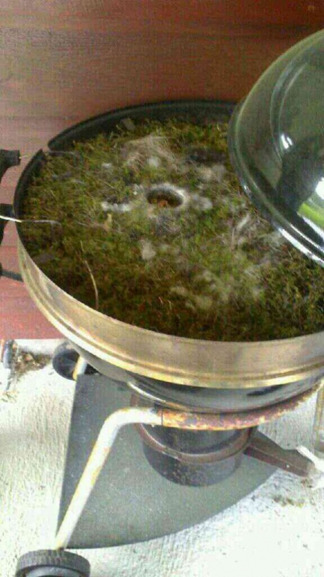 Ein fugl har fylt heile grillen med mose, og laga eit perfekt rundt lite reir.