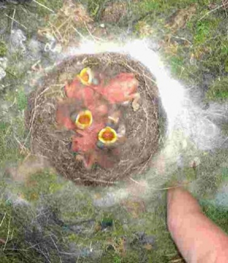 Fem små, rosa og fjøyrlause fugleungar ventar på mat frå mor.