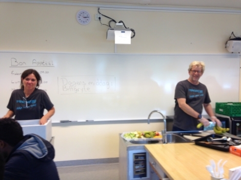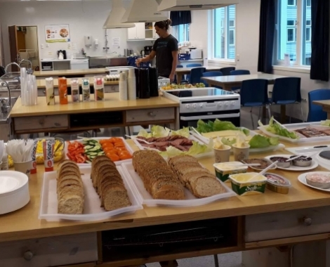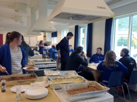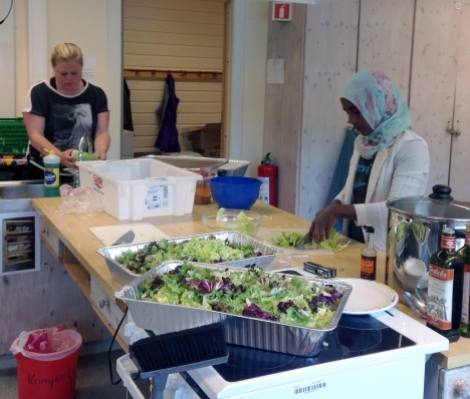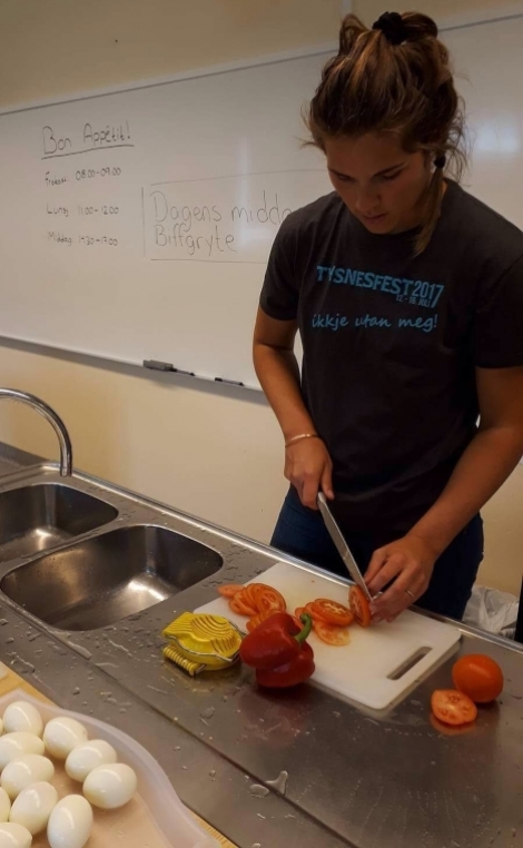 Malin Kongsvik, som har eit overordna ansvar for denne gruppa, fortel at det er sett opp ulike vakter for å fordele arbeidsoppgåvene. Det vert laga frukost, lunsj og middag kvar dag. Kor mange som kjem innom og et varierer, alt frå 80 til 145 personar dei siste dagane.