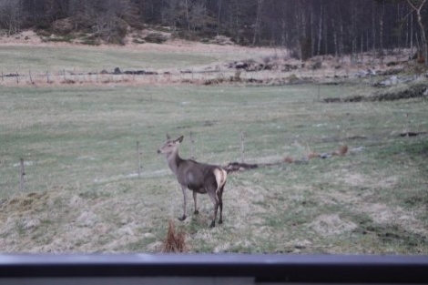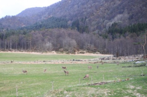 Mange hjortar trekker no ned til frisk eng for å smaka våren.
