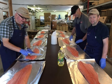 Fredag føremiddag var Alsaker sjølv i full sving med klargjering av herremåltidet i lag med dei gode hjelparane Oddvar Helland og Åge Enes. Dei tre rutinerte karane kutta, krydra og pakka ei lakseside per minutt. Dermed gjekk det unna som på eit samleband.