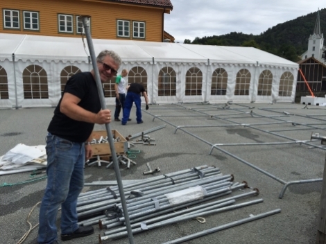 Han kan elles opplysa om at godvêr er bestilt til kvelden. Dersom det ikkje slår til, er det leverandøren som sviktar – ikkje bestillinga. For sikkerheits skuld er det sett opp ekstra telt, slik at alle skal få koma inn under tak.