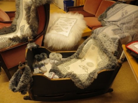 Per Ingolf fortel at dette er laga frå pels-sau skinn, og at det er Jorunn som syr og trykkjer mønster.