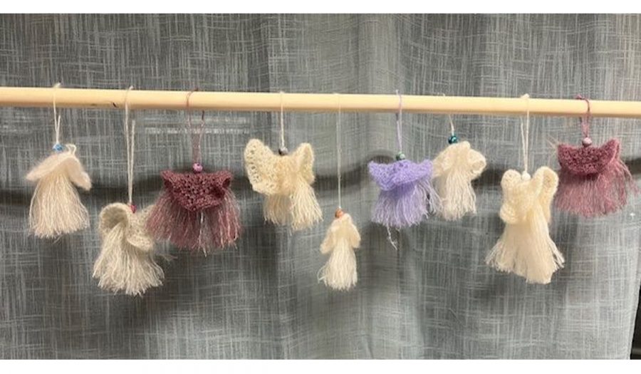 Planlagt aktivitet var å strikke vinger til engler i tynt garn, og alle hev seg på oppgaven med stor iver.  Deretter viklet vi garn rundt et postkort og lagde kroppen på den måten. Til slutt kronet vi verket med en perle til hode. Enklere blir det nesten ikke! Men det var tydelig at aktiviteten falt i smak, for det var faktisk helt stille rundt bordet en stakket stund mens alle konsentrerte seg om oppgaven.