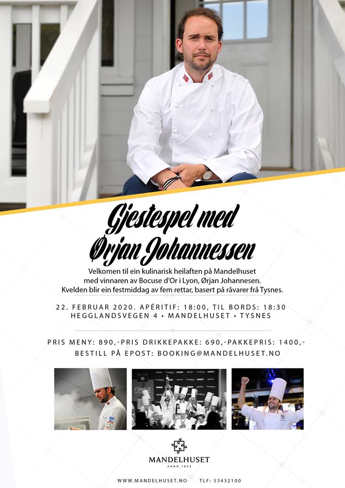 Ørjan Johannessen, er frå Austevoll og vaks opp på kjøkkenet med kokkeforeldra sine ved Bekkjarvik Gjestgiveri. Han er to gonger kåra til Årets Kokk i Noreg, vann Bocuse d’Or Europe i 2012 og i 2015 vann han Bocuse d’Or i Lyon (VM i kokkekunst). Johannessen er ein allroundar på kjøkkenet med stor sans for lokale råvarer og tradisjonelle rettar med ein ny vri. Han er mykje ute og reiser, og vitjar mange ulike kulturar med eit mål for auga: Inspirasjon! Me gledar oss til å sjå kva han gjer med råvarane frå Tysnes.