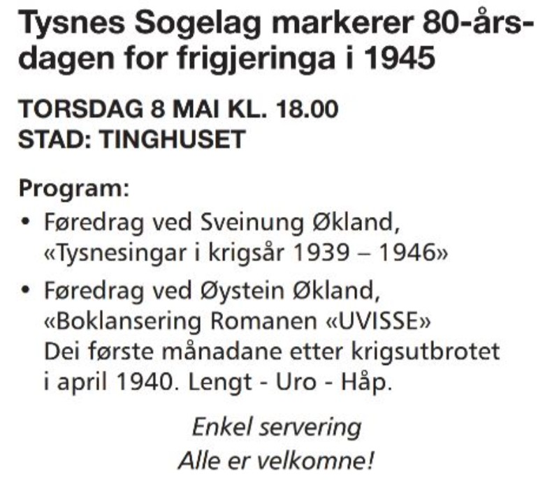 Tysnes Sogelag; markering av 80 års dagen for frigjeringa 1945