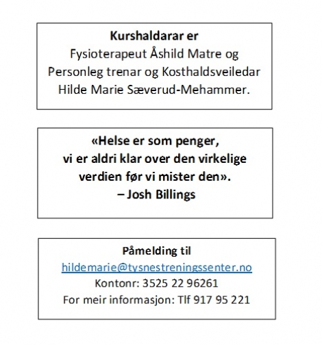 Oppstart er måndag 08. februar og kurset går ein gong i veka over 10 veker på mandager kl 16.15 – 17.45. Det er plass til 12 stk. Påmelding og 50 % innbetaling av totalbeløpet innan fredag 05. februar for å sikre deg plassen. Resten av totalbeløpet skal innbetalast innan 01. mars. Det er begrensa antall plassar og første mann til mølla!