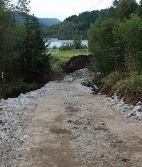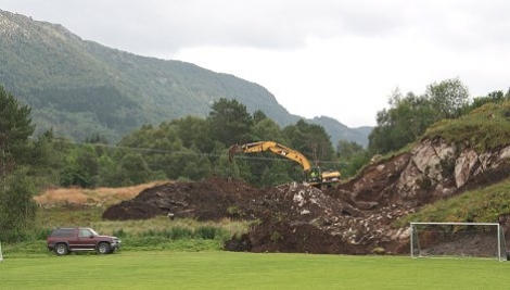 Rune’s Maskin sine maskiner er i full gong med grunnarbeidet til kunstgrasbanen. For å koma til med maskiner til området måtte dei rusta opp gamlevegen over Rolse til Reiso for å koma fram. Dette fordi brua over Reiso-elva truleg ville vera for svak til å tåla anleggstrafikk over.