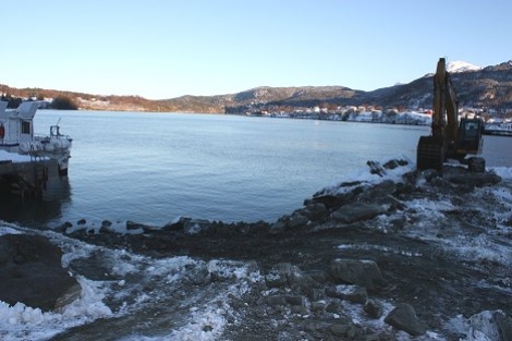Gravemaskinen til Rune’s Maskin har starta arbeidet med å bearbeida massane som skal liggja i botn, og til Tysnesingen seier Rune Hillesvik at dei reknar med det vil gå 3-4 dagar med det arbeidet det skal gjera.