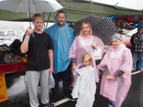 Familien Ersland Prestnes frå Sunde. Gjengen har vitja Tysnesfest kvart år og trossar gråvèret med fargerike regnponsjoer.