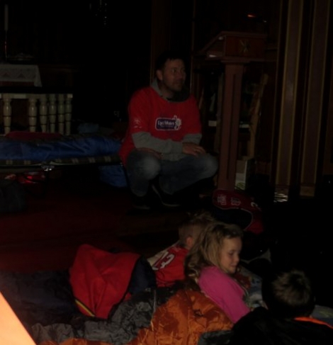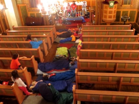 På trass av eit variert program både i og utanfor kyrkja frå kl. 18 og utover i går, var dei aller fleste 4. klassingane framleis Lys Vaken rundt midnatt! Kl. 0100 byrja det derimot å bli stille i Reksteren kyrkje og dei fleste hadde sovna.