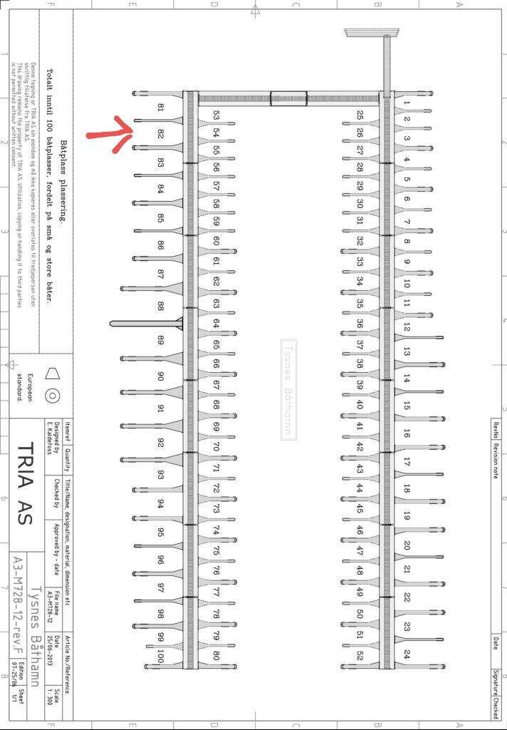Plass 82 ligg nest innerst på utsida av utriggaren til høgre på bildet.