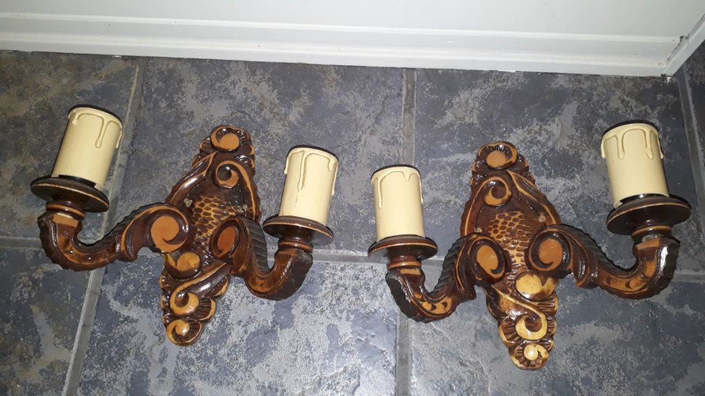 Ønskjer å selje gammal lysekrone ( ca 70 år) i utskore tre, med 2 doble lampettar. Dessverre ikkje originale skjermar. Må fiksast noko.