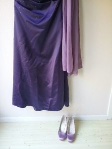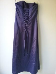 1. Mørk lilla selskapskjole, EbonyRose engelsk str 14. Smale skulderstroppar, snøring i ryggen. Brukt 1 gong. Kr 1500.