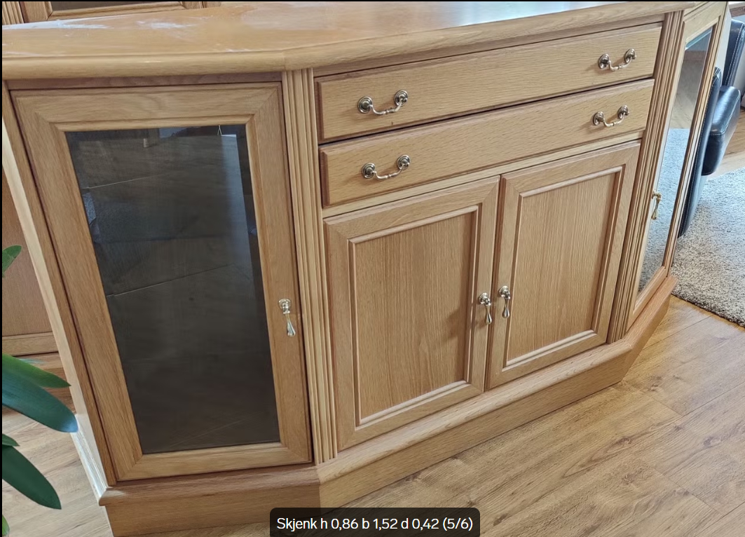 Pent brukt vitrineskap og skjenk i lys eik. Selges samlet eller hver for seg.