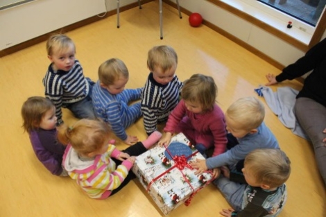 Pakken vart teken med inn og pakka opp. Inni var det små pakkar med namnet til barna, og då pakkane vart pakka opp var det rosiner.